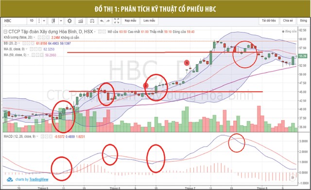 Nhìn trên đồ thị thì giá cổ phiếu HBC tích lũy quanh vùng SMA màu đỏ ở giữa một khoảng thời gian khá lâu và không xuyên thủng vùng này, đây chính là vùng P min của cổ phiếu HBC. Những nhà đầu tư nào chỉ áp dụng phân tích kỹ thuật thì sau khi mua ở vùng giá 37.000 - 38.000 đồng có thể tạm chốt lời ở đây (khoảng 44.000 đồng). Nhưng có thêm phương pháp P/E min max, nhà đầu tư có thể chờ đợi để giải ngân thêm. Thực tế, cổ phiếu HBC có một phiên như vậy vào ngày 16/9, giá và khối lượng tăng mạnh. Theo đó, đường giá tăng và bám sát đường SMA màu xanh, mà không xuyên thủng đường này.