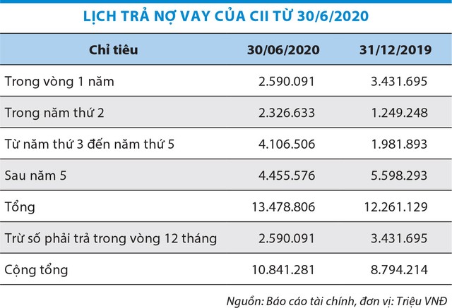 Chính vì huy động vốn liên tục như vậy trong nhiều năm, áp lực đáo nợ của CII ngày một gia tăng. Số nợ vay đáo hạn trong vòng 1 năm tới (tính từ thời điểm cuối tháng 6/2020) của CII lên tới 2.590,1 tỷ đồng. Đây là các khoản vay trái phiếu, ngân hàng thương mại mà doanh nghiệp đã huy động vốn nhiều năm về trước.
