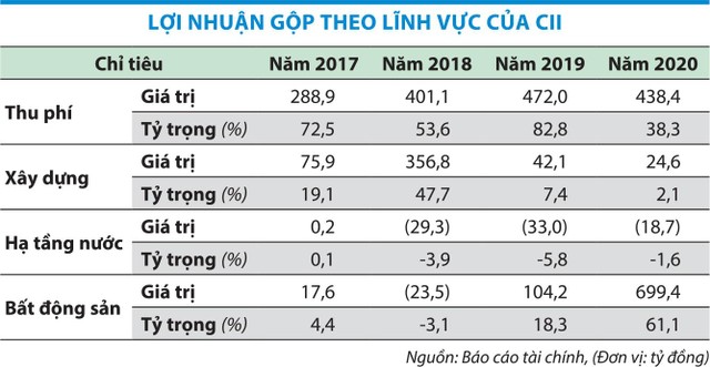Giai đoạn 2017 - 2020, cơ cấu lợi nhuận gộp của CII có sự dịch chuyển từ lĩnh vực thu phí sang lĩnh vực bất động sản, trong khi lĩnh vực hạ tầng nước thường xuyên thua lỗ. Nếu như năm 2017, tỷ trọng lợi nhuận gộp lĩnh vực thu phí giao thông chiếm 72,5%, thì tới năm 2020 chỉ còn 38,3%. Trong khi đó, tỷ trọng lợi nhuận gộp lĩnh vực bất động sản tăng từ 4,4% lên 61,1%.