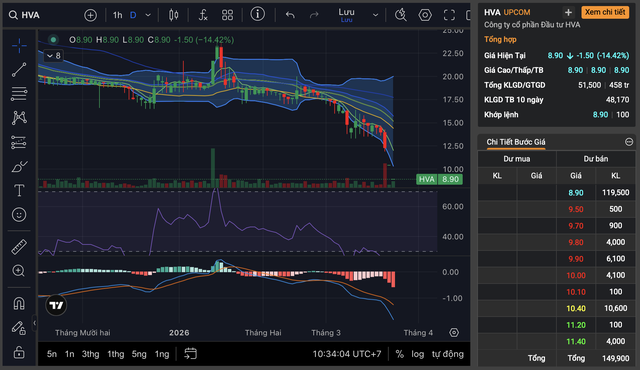 Cụ thể, sau phiên giảm sàn ngày 23/3, cổ phiếu HVA tiếp tục mở cửa phiên 24/3 trong trạng thái trắng bên mua. Tính tại thời điểm 10h33, cổ phiếu HVA đã giảm về mức giá 8.900 đồng/CP với khối lượng dư bán sàn đạt gần 120.000 đơn vị. Như vậy, so với thời điểm đầu năm, thị giá cổ phiếu HVA đã mất hơn một nửa.