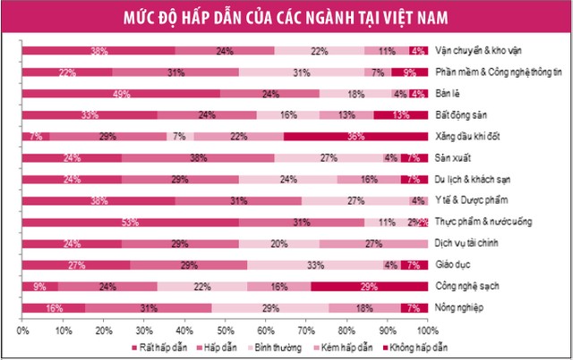 Phần lớn ý kiến khảo sát cho rằng, mức độ hấp dẫn đầu tư ở Việt Nam là “hấp dẫn” và “rất hấp dẫn”. Đội ngũ lao động dồi dào, chi phí thấp, sự tăng trưởng mạnh mẽ của tầng lớp trung lưu là các yếu tố thu hút nhà đầu tư nước ngoài.