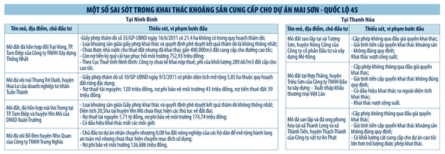 Tại Kết luận số 1086, Thanh tra Chính phủ cho biết, qua xem xét 19 hồ sơ cấp phép các dự án khai thác khoáng sản làm vật liệu xây dựng thông thường cung cấp cho dự án đường cao tốc do các sở Tài nguyên và Môi trường các tỉnh Ninh Bình, Thanh Hóa cung cấp, bước đầu cho thấy, còn có một số thiếu sót, vi phạm. Các lỗi vi phạm phổ biến được phát hiện là cấp phép không qua đấu giá quyền khai thác; giá tính tiền cấp quyền khai thác khoáng sản không đúng quy định; khai thác vượt công suất; loại khoáng sản giữa giấy phép khai thác và quyết định phê duyệt kết quả thăm dò không thống nhất; nợ thuế tài nguyên, nợ phí bảo vệ môi trường…