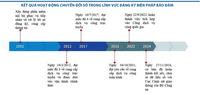 * 100% nhóm dịch vụ công về đăng ký, cung cấp thông tin về biện pháp bảo đảm (6 dịch vụ công) thuộc phạm vi quản lý của Bộ Tư pháp đều đạt và đáp ứng khả năng cung cấp ở mức độ dịch vụ công trực tuyến toàn trình bởi Hệ thống đăng ký trực tuyến (hệ thống) do Cục Đăng ký quản lý, vận hành. Theo số liệu thống kê, tỷ lệ đăng ký, cung cấp thông tin trực tuyến về biện pháp bảo đảm đã tăng hơn 68% so với thời điểm bắt đầu chính thức triển khai hệ thống (năm 2012 đạt 17,58% và hiện nay đạt 87% tính đến tháng 11/2024). Chữ ký số cũng đã được áp dụng toàn bộ trong quá trình giải quyết hồ sơ và trả kết quả đăng ký, cung cấp thông tin trực tuyến cho người dân, doanh nghiệp.