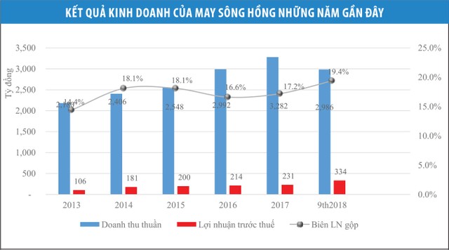 Trong quý III/2018, May Sông Hồng đạt doanh thu 1.189 tỷ đồng, tăng 26%; biên lợi nhuận gộp đạt 20,4%, tăng hơn 4% so với quý III/2017. Cùng với đó, doanh thu tài chính tăng, trong khi tổng các chi phí tài chính, chi phí bán hàng, chi phí quản lý doanh nghiệp hầu như không đổi, nên Công ty đã thu về lợi nhuận trước thuế 161,1 tỷ đồng, gấp gần 2,7 lần cùng kỳ năm trước, ghi nhận quý có lợi nhuận cao nhất trong nhiều năm trở lại đây.