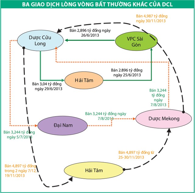 Như Đầu tư Chứng khoán đã phản ánh, trong năm 2013, tại Dược Cửu Long tồn tại khá nhiều giao dịch mang tính lòng vòng, bất thường. Ngoài vòng trong giao dịch khép kín diễn ra trong 2 ngày là ngày 7/12 và ngày 9/12/2013 giữa Dược Cửu Long – VPC Sài Gòn (công ty 100% vốn của Dược Cửu Long) và An Tâm (một khách hàng có công nợ lớn tại Dược Cửu Lòng) đã thể hiện, một số giao dịch lòng vòng khép kín khác cũng được thực hiện (xem bảng).