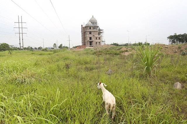 Con dê đang gặm cỏ tại khu đất trống trong Khu đô thị Phú Lương, không xa là biệt thự khủng xây dựng không phép