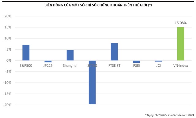 Việc khối ngoại mua ròng trở lại đã tạo động lực cho sự phục hồi của thị trường. Chỉ số VN-Index vượt mốc 1.400 điểm, đạt mức cao nhất trong hơn 3 năm qua và đang hướng tới mức kỷ lục hơn 1.500 điểm đã thiết lập vào năm 2022. Tính đến hết ngày 11/7, VN-Index đạt 1.457,76 điểm, tăng 5,94% so với cuối tháng 6 và tăng 15,01% so với cuối năm 2024. Với sự tăng trưởng này, thị trường chứng khoán Việt Nam trở thành một trong các thị trường tăng điểm nhanh nhất trong khu vực và thế giới.