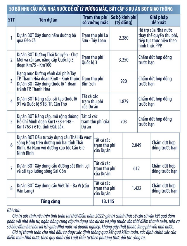 Tại Tờ trình số 10189, Bộ GTVT kiến nghị Chính phủ trình Quốc hội chấp thuận chủ trương giải pháp thực hiện và bố trí vốn ngân sách nhà nước (khoảng 13.115 tỷ đồng) để thanh toán cho nhà đầu tư/doanh nghiệp dự án của 7 dự án (khoảng 10.835 tỷ đồng) và bổ sung vốn nhà nước (khoảng 2.280 tỷ đồng) hỗ trợ Dự án Xây dựng hầm đường bộ qua Đèo Cả. Đồng thời, kiến nghị Quốc hội giao Chính phủ chỉ đạo rà soát, hoàn thiện pháp luật về PPP, bảo đảm công bằng, hài hòa lợi ích giữa các bên, khả thi về tổ chức thực hiện.