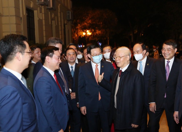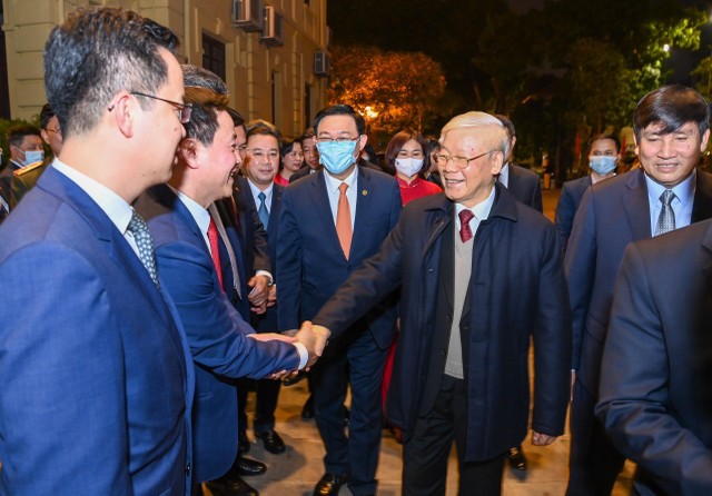 Trước thời khắc giao thừa, Tổng Bí thư, Chủ tịch Nguyễn Phú Trọng đi bộ bên Hồ Gươm, ân cần thăm hỏi, chúc Tết nhân dân và du khách...