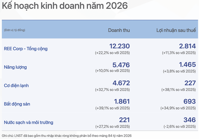 Về kế hoạch kinh doanh năm 2026, REE đặt mục tiêu doanh thu 12.230 tỷ đồng và lợi nhuận sau thuế 2.814 tỷ đồng, lần lượt tăng trưởng 22,2% và 11,3% so với thực hiện năm 2025.