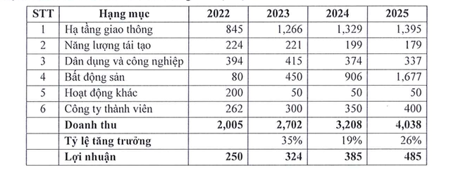 Trên cơ sở chính sách của Chính phủ về việc phát triển lĩnh vực hạ tầng giao thông đối với tuyến cao tốc Bắc - Nam, cũng như việc phát triển hạ tầng liên vùng thì doanh thu từ các hợp đồng dự án dự kiến ký kết thực hiện, đã và đang trong quá trình đấu thầu, chỉ định thầu, doanh thu từ các đơn vị thành viên công ty thành viên, bất động sản là 1.100 tỷ đồng.