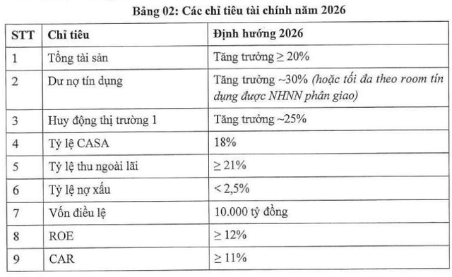 Dư nợ cho vay khách hàng được kỳ vọng đạt 61.770 tỷ đồng, tăng 31%, trong khi huy động vốn dự kiến đạt 103.593 tỷ đồng, tăng 27,7%. Về hiệu quả, ngân hàng đặt mục tiêu ROE tối thiểu 12%, duy trì hệ số an toàn vốn (CAR) trên 11% và kiểm soát tỷ lệ nợ xấu dưới 2% - những ngưỡng được xem là cân bằng giữa tăng trưởng và an toàn trong bối cảnh thị trường còn nhiều biến động.