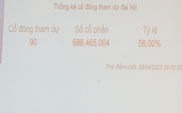Theo đó, đến 9h, số cổ đông tham dự là 90, với tổng số trên 668 triệu cổ phần, tương đương 56% cổ đông tham gia.