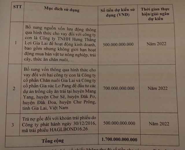 Tổng số tiền dự kiến thu được là 1.700 tỷ đồng dự kiến để bổ sung vốn lưu động cho các công ty con gồm Công ty TNHH Hưng Thắng Lợi Gia Lai (mua bán vật tư nông nghiệp, trái cây, thức ăn chăn nuôi); CTCP Chăn nuôi Gia Lai, CTCP Gia Súc Lơ Pang (đầu tư các dự án trồng cây ăn trái).