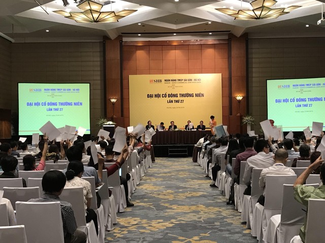 Trước câu hỏi của cổ đông có nhất thiết phải trả toàn bộ cổ tức năm 2017 - 2018 bằng cổ phiếu hay không vì hệ số CAR của ngân hàng năm 2018 đạt 11,79% (cao hơn mức qui định 9% của NHNN), ông Đỗ Quang Hiển, Chủ tịch HĐQT SHB cho biết, trong quá trình xử lý nợ xấu Habubank có nợ của Vinashin, theo đề án tái cơ cấu đã được NHNN phê duyệt, riêng khoản nợ của Vinashin bán cho VAMC có thời gian trích lập là 8 năm. Mặt khác, NHNN có Thông tư 08 có quy định, những TCTD có trái phiếu VAMC trên 5 năm sẽ không được chia cổ tức.