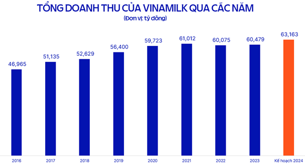 Năm 2023, Vinamilk ghi nhận 60.368 tỷ đồng doanh thu thuần, tăng 0,7% so với cùng kỳ và đánh dấu năm thứ ba liên tiếp đạt mốc doanh thu hơn 60.000 tỷ đồng; lợi nhuận sau thuế hợp nhất đạt 9.019 tỷ đồng, tăng 5,2% và hoàn thành 105% kế hoạch năm.