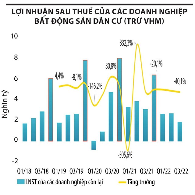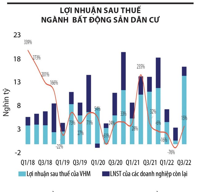 Báo cáo thị trường quý III/2022 của Wigroup - đơn vị chuyên cung cấp dữ liệu và giải pháp công nghệ tài chính tại Việt Nam cho thấy, lợi nhuận sau thuế toàn ngành bất động sản dân cư dù tăng 15% so với cùng kỳ năm trước, nhưng động lực tăng trưởng chủ yếu đến từ một cái tên là Công ty cổ phần Vinhomes (mã VHM) khi chiếm tới gần 90% lợi nhuận toàn ngành. Nếu không tính Vinhomes, tổng lợi nhuận của các doanh nghiệp bất động sản dân cư còn lại chỉ đạt 1.838 tỷ đồng, giảm 40% so với cùng kỳ năm trước.
