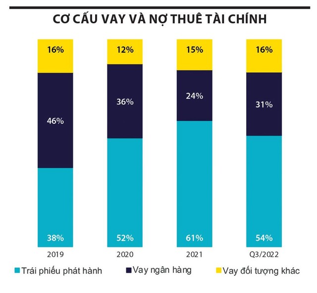 Wigroup cho rằng, không khó để nhìn ra sự khó khăn của các doanh nghiệp địa ốc khi các kênh huy động vốn quan trọng nhất đều bị chặn lại, bao gồm cả trái phiếu doanh nghiệp, trong đó phổ biến nhất là các trái phiếu có kỳ hạn từ 2-5 năm. Trước đó, trong giai đoạn cao điểm nhất, tỷ lệ đóng góp từ kênh trái phiếu doanh nghiệp trong cơ cấu nguồn vốn vay dài hạn của các doanh nghiệp bất động sản dân cư chiếm tới hơn 60% (vào thời điểm cuối năm 2021). Tuy nhiên, trước các biện pháp kiểm soát chặt chẽ từ cơ quan quản lý, tỷ lệ này đã giảm về mức 54% tính đến quý III/2022. Wigroup dự báo, xu hướng giảm sẽ còn tiếp diễn khi thời gian đáo hạn các lô trái phiếu cũ đến gần và việc phát hành mới không còn dễ dàng như trước.