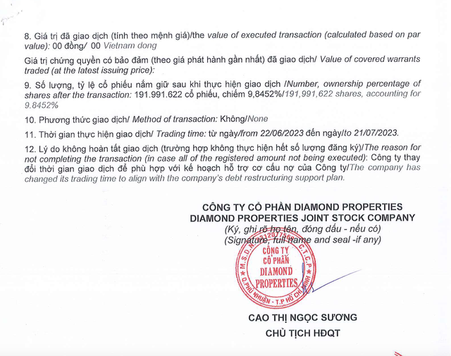 Theo đó, Diamond Properties đã không bán cổ phiếu nào trong tổng số 13,6 triệu cổ phiếu đăng ký, lý do là công ty thay đổi thời gian giao dịch để phù hợp với kế hoạch hỗ trợ cơ cấu nợ của công ty.