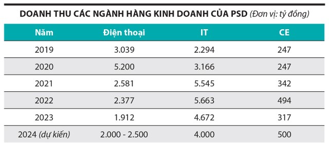So với mảng điện thoại và IT, mảng CE chiếm chưa tới 5% cơ cấu doanh thu của PSD năm 2023. Nhưng năm 2024, PSD muốn tăng tỷ trọng mảng CE lên 6,9% (so với kế hoạch doanh thu), đạt 500 tỷ đồng và lợi nhuận từ 4 - 5 tỷ đồng. Trong giai đoạn tới, PSD muốn đưa ngành hàng CE trở thành ngành hàng quan trọng, song song với IT và điện thoại.