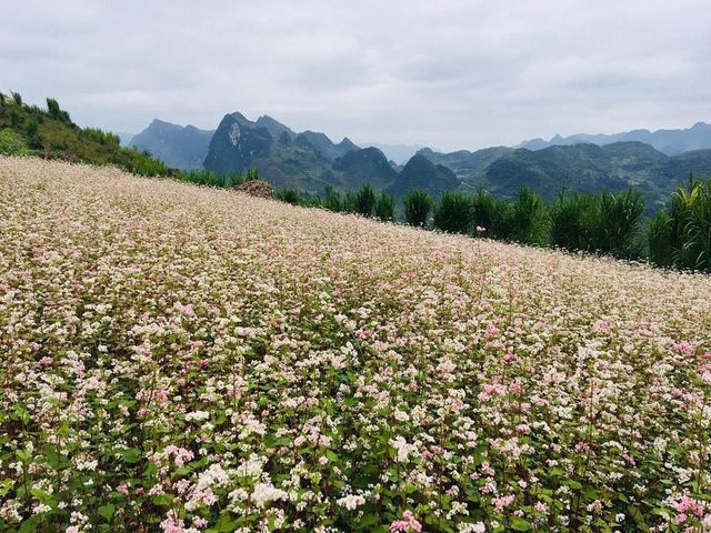 Khác với hoa tam giác mạch ở các nơi khác, ở Hà Giang loại hoa này có màu phơn phớt hồng, mọc thành từng cánh đồng lớn ven đường, thung lũng thậm chí len lỏi trên những vách đá lởm chởm. Những cánh đồng hoa trải dài tạo cho nơi đây cảnh sắc vừa nên thơ vừa hùng vĩ.
