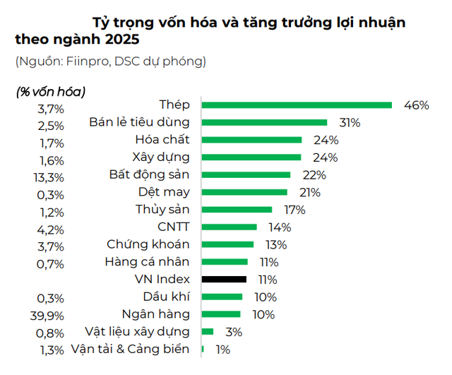 Theo DSC dự phóng, Ngân hàng sẽ chiếm tới 39,8% tỷ trọng lợi nhuận toàn thị trường, và 4,4% mức tăng trưởng lợi nhuận năm 2025 toàn thị trường. Tuy nhiên những ngành có mức tăng trưởng lợi nhuận lớn nhất lại là Thép, Bán lẻ, Hóa chất, và Xây dựng.