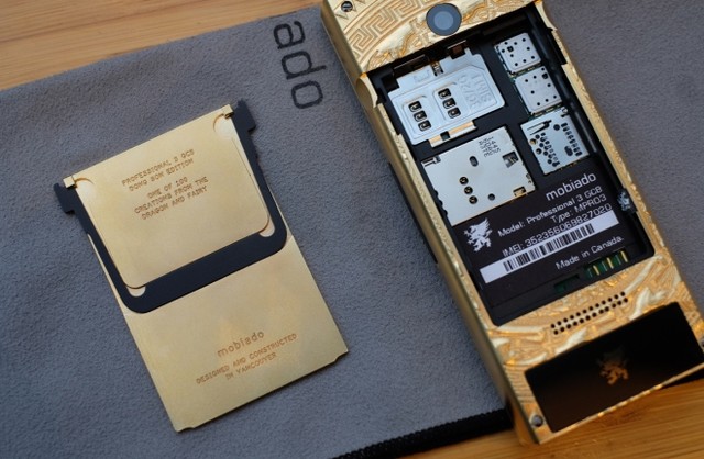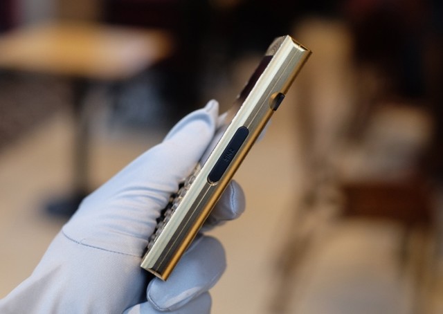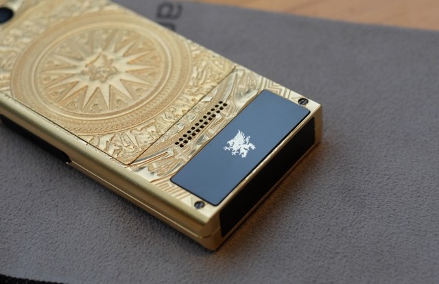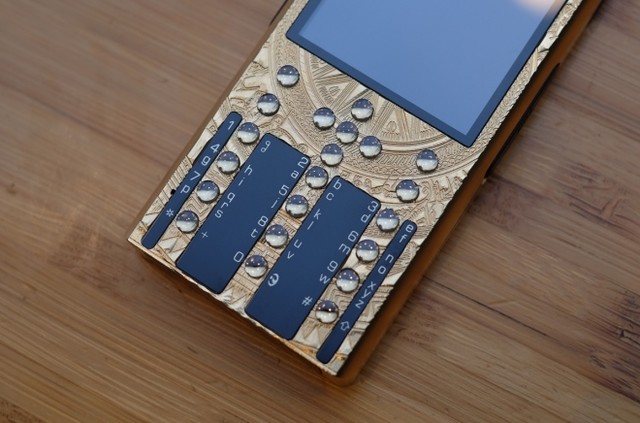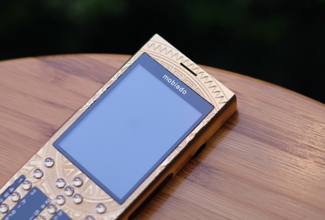Mobiado Professional 3 GCB - Dong Son Antique có lớp vỏ mạ vàng 24K, khắc họa tiết trống đồng Đông Sơn và các phím bấm đều bằng sapphire.