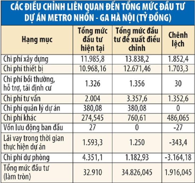 Cũng tại tờ trình trên, UBND TP. Hà Nội đưa ra tổng mức đầu tư mới của Dự án là 34.826 tỷ đồng (tăng 1.916 tỷ đồng), trong đó ngân sách Thành phố tăng 3.895,93 tỷ đồng và giảm vốn vay ODA 1.979,93 tỷ đồng, đồng thời xin gia hạn thời gian các hiệp định vay của Dự án đến hết ngày 31/12/2029 (đến hết thời hạn bảo hành Dự án).
