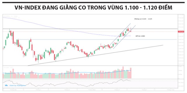 Chỉ số có khả năng điều chỉnh sau nhịp tăng điểm ngắn hạn do nhiều yếu tố như tâm lý chốt lời tăng dần quanh vùng giá 1.100 - 1.120 điểm; diễn biến giằng co tạo ra nến các phiên trong tuần tăng/giảm đan xen, vận động trong mẫu hình kênh giá tăng, biên độ của kênh hẹp và dốc; phiên ngày 16/6/2023 có khối lượng tăng mạnh cùng với diễn biến giá giảm xác nhận đỉnh ngắn hạn của VN-Index; chỉ báo RSI tiến vào vùng quá bán và tạo phân kỳ âm với giá cho thấy sức mạnh giá đang yếu đi.