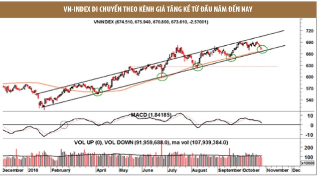 Phần lớn thời gian trong năm 2016, VN-Index di chuyển theo kênh giá tăng với biên độ tương đối hẹp và độ dốc vừa phải. Trong ngắn hạn, 1 tháng qua, sau lần tiếp cận cạnh trên của kênh giá tăng, đường giá đã chuyển sang pha tích lũy và giảm trở lại để kiểm tra vùng hỗ trợ quan trọng quanh vùng 670 điểm - khu vực cạnh dưới kênh giá tăng, đồng thời là vùng di chuyển của đường trung bình động (MA) trung hạn. Tùy thuộc vào cách ứng xử của đường giá tại khu vực 670 điểm mà chúng ta có thể kỳ vọng “con sóng lớn” tiếp theo của VN-Index sẽ theo chiều nào.