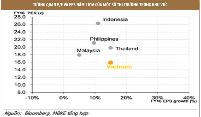 Bên cạnh yếu tố vĩ mô tương đối lạc quan, định giá của thị trường chứng khoán Việt Nam cũng là điểm tạo ra sự hấp dẫn. Trong nhóm “ASEAN - 5” (không tính Singapore), thị trường chứng khoán tại nhóm này đang duy trì mức P/E dự phóng trung bình cho năm 2016 quanh ngưỡng 22 lần, trong khi thông số này dành cho thị trường chứng khoán Việt Nam khoảng gần 16 lần.