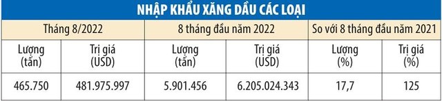 Theo đánh giá của Bộ Công thương, nhu cầu xăng dầu cả nước năm 2022 khoảng 20,6 triệu tấn, được đáp ứng từ sản xuất trong nước và nhập khẩu. Năm 2021, nhập khẩu xăng dầu cả nước là 6,94 triệu tấn, còn 8 tháng đầu năm nay, con số là 5,9 triệu tấn. Hiện Nhà máy Lọc dầu Dung Quất và Liên hợp Lọc hóa dầu Nghi Sơn được các cơ quan hữu trách cho là đáp ứng khoảng 70% nhu cầu xăng dầu của cả nước.
