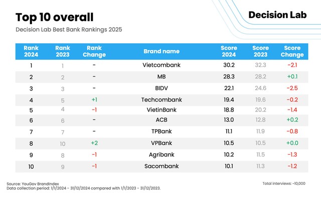 Từ góc độ khảo sát thị trường, Decision Lab vừa công bố Bảng xếp hạng Ngân hàng Tốt nhất 2025 dựa trên hơn 10.000 cuộc phỏng vấn thường niên với người tiêu dùng Việt Nam công bố cùng ngày cho thấy, MB xác lập vị trí số 1 trong nhóm TMCP và số 2 trong Bảng xếp hạng Ngân hàng tốt nhất toàn ngành, khẳng định vai trò quan trọng trong thị trường và khả năng đáp ứng hiệu quả nhu cầu ngày càng cao của khách hàng thông qua các chiến lược đổi mới sáng tạo và lấy khách hàng làm trung tâm.