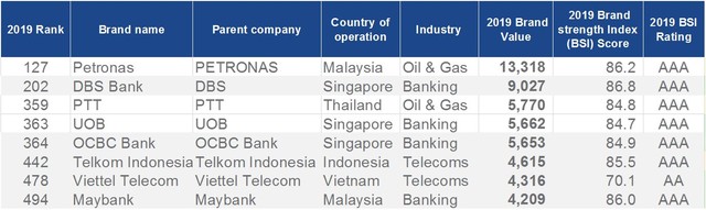 Trong tổng số khoảng 5.000 doanh nghiệp trên toàn thế giới, trong đó khoảng 500 doanh nghiệp Đông Nam Á được đưa vào đánh giá, chỉ có 8 thương hiệu ASEAN lọt vào danh sách này bao gồm 3 lĩnh vực viễn thông, dầu khí và ngân hàng.