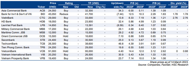 Cùng chung quan điểm cổ phiếu HDB có thể tăng giá trên 30%, phương pháp luận để lựa chọn cổ phiếu ngân hàng của Chứng khoán HSC còn tính thêm tính ổn định của ngân hàng. HSC cho rằng, trong bối cảnh nền kinh tế toàn cầu đang chịu nhiều khủng hoảng do tác động từ sự sụp đổ của một số ngân hàng nước ngoài thì việc lựa chọn cổ phiếu ngân hàng để đầu tư cần quan tâm đầu tiên là mức độ ổn định của từng ngân hàng trong đó yếu tố cơ sở tiền gửi đa dạng, ổn định và ít đầu tư vào chứng khoán là 2 yếu tố lớn nên xem xét.