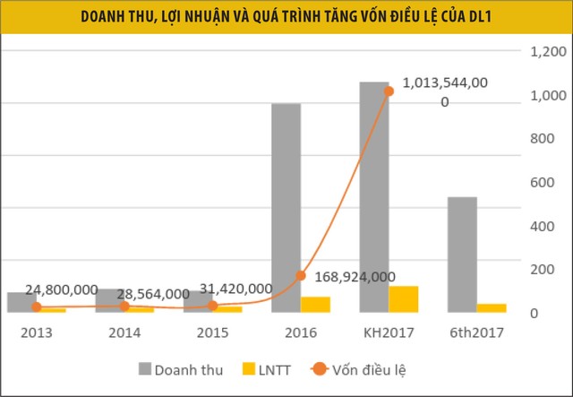 Đáng chú ý, đây là năm thứ 2 liên tiếp DL1 tăng vốn khủng. Năm 2016, Công ty cũng tăng vốn gấp 5 lần, từ 31,4 tỷ đồng lên 168,9 tỷ đồng qua chia tách cổ phiếu và phát hành hơn 12 triệu cổ phiếu để hoán đổi và sáp nhập CTCP Khoáng sản và luyện kim Tây Nguyên. Nếu hoàn thành đợt phát hành thành công, quy mô vốn của DL1 sẽ lên tới 1.014 tỷ đồng, tăng 28,8 lần so với số vốn cuối năm 2015.