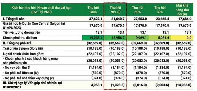 Bảng cân đối kế toán ngày 31/12/2022 ghi nhận, giá trị vốn góp chủ sở hữu của Saigon Glory ở mức 7.000 tỷ đồng. Tuy nhiên, sau khi định giá lại giá trị dự án One Central Saigon, đánh giá lại khả năng thu hồi khoản phải thu và khả năng thanh toán nợ phải trả đến hạn, nợ tiềm tàng lãi vay phát sinh trên tổng nợ phải trả, DSC kết luận, giá trị hợp lý của vốn góp chủ sở hữu tại thời điểm 1/9/2023 âm hơn 1.000 tỷ đồng (xem bảng), trong trường hợp các khoản phải thu có khả năng thu hồi 70%. Trường hợp tỷ lệ thu hồi thấp hơn, giá trị phần vốn chủ sở hữu còn âm lớn hơn nhiều.