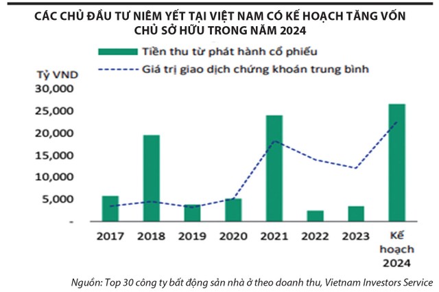 Theo VIS Rating, các chủ đầu tư niêm yết đã công bố kế hoạch tăng vốn chủ sở hữu trong các kỳ đại hội cổ đông gần đây, trong bối cảnh định giá TTCK phục hồi từ đầu năm 2024. Nếu thành công, khoảng 26.000 tỷ đồng vốn chủ sở hữu mới sẽ được huy động cho phát triển dự án hoặc để đáp ứng các nghĩa vụ nợ đáo hạn, lần lượt là 75.000 tỷ đồng trong năm 2024 và hơn 90.000 tỷ đồng trong năm 2025 tại các doanh nghiệp niêm yết được VIS Rating theo dõi.