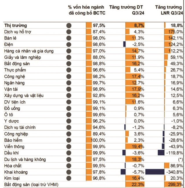 Theo thống kê của Công ty Chứng khoán VNDirect, tính đến ngày 1/11/2024, có 1.058 doanh nghiệp niêm yết (chiếm 97,5% tổng vốn hóa thị trường chứng khoán) đã công bố báo cáo tài chính. Theo đó, lợi nhuận ròng của toàn thị trường đạt mức tăng trưởng 18,8% dựa trên mức nền thấp của năm ngoái.