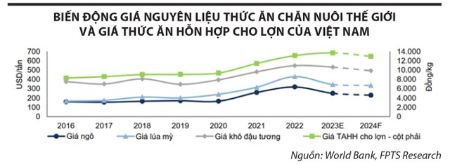 Các doanh nghiệp lớn đã tự chủ phần nào về thức ăn chăn nuôi nhờ phát triển mô hình 3F (quy trình sản xuất thực phẩm an toàn, bắt đầu từ thức ăn chăn nuôi tới quá trình nuôi ở các trang trại và chế biến thực phẩm), nhưng nguyên vật liệu đầu vào cho sản xuất vẫn phụ thuộc nhiều vào nhập khẩu. Năm 2023, giá các nguyên liệu thức ăn chăn nuôi chính đều giảm so với năm 2022 như ngô hạt giảm 12,5%, khô dầu đậu tương giảm 3,1%, nhưng vẫn cao hơn giai đoạn trước dịch Covid-19 từ 32 - 46%, tác động đến biên lợi nhuận của doanh nghiệp.