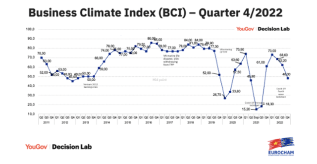 Theo Chỉ số Môi trường Kinh doanh (BCI) do Hiệp hội Doanh nghiệp châu Âu tại Việt Nam (EuroCham) công bố, đánh giá của cộng đồng doanh nghiệp châu Âu về môi trường kinh doanh của Việt Nam đã giảm 14,2 điểm xuống 48 điểm phần trăm trong quý IV/2022 và giảm 25 điểm so với quý đầu năm.