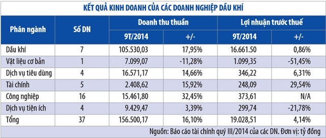 Tạm chia các DN thành 6 phân ngành là dầu khí, vật liệu cơ bản, dịch vụ tiêu dùng, tài chính, công nghiệp và dịch vụ tiện ích. Trong số này, nhóm phân ngành dầu khí có 7 DN, gồm GAS, PVD, PVS, PVC, PGS, CNG và PVG, nhưng doanh thu và lợi nhuận 9 tháng đầu năm 2014 chiếm lần lượt 67,43% và 87,56% con số của 37 DN cộng lại.
