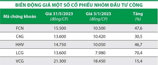 Không ít cổ phiếu khác trong nhóm đầu tư công như HHV, C4G, LCG… tăng giá trong tháng 5 cũng như 5 tháng đầu năm 2023, nhờ tình hình hoạt động của doanh nghiệp có diễn biến khả quan.