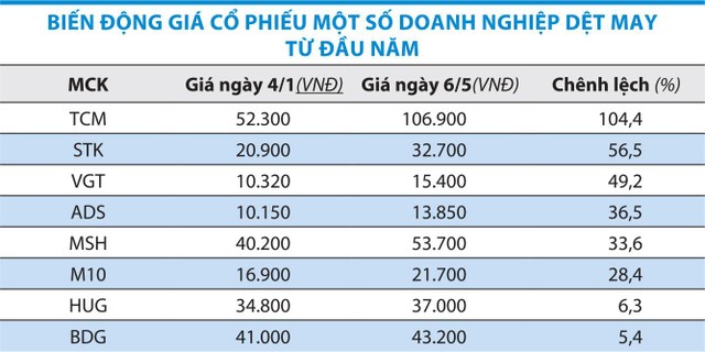 Trên sàn chứng khoán, cổ phiếu ngành dệt may ghi nhận tăng trưởng mạnh từ đầu năm 2021 (xem bảng).