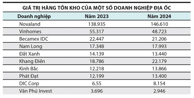 Số liệu tổng hợp từ báo cáo tài chính của 130 doanh nghiệp địa ốc đang niêm yết, giao dịch cổ phiếu trên sàn chứng khoán cho thấy, tại thời điểm cuối năm 2024, tổng lượng hàng tồn kho bất động sản vào khoảng hơn 462.700 tỷ đồng, tăng hơn 10.000 tỷ đồng so với cuối năm 2023. Tồn kho tập trung chủ yếu ở các doanh nghiệp lớn như Novaland, Vinhomes, Becamex IDC, Nam Long, Đất Xanh, Khang Điền, Kinh Bắc, Phát Đạt, DIC Corp và Văn Phú Invest, với tổng giá trị đạt hơn 308.000 tỷ đồng.