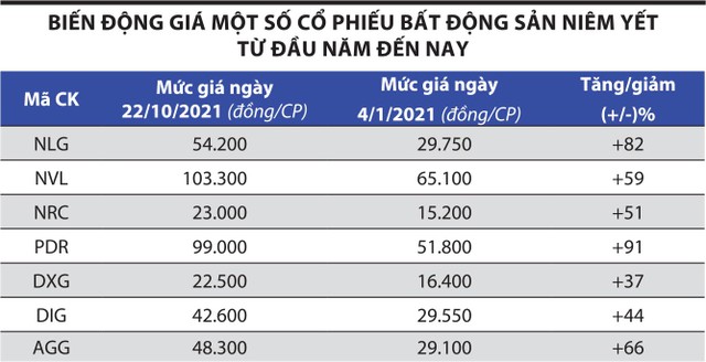 Đơn cử, cổ phiếu NLG của Nam Long Group ghi nhận mức tăng ấn tượng từ đầu năm đến nay, khi đóng cửa phiên giao dịch ngày 22/10/2021 ở mức giá 54.200 đồng/cổ phiếu, tăng hơn 82% so với mức giá 29.750 đồng/cổ phiếu ngày 4/1/2021. Tương tự, cổ phiếu AGG của Bất động sản An Gia cũng tăng gần 66%, từ mức 29.100 đồng/cổ phiếu ngày 4/1/2021 lên mức 48.300 đồng/cổ phiếu ngày 22/10/2021.