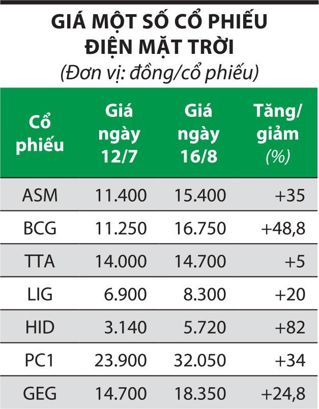 Trong vòng 1 tháng qua, nhóm cổ phiếu năng lượng tái tạo đều tăng giá. Cụ thể, mã BCG tăng từ 11.200 đồng/cổ phiếu ngày 12/7 lên 16.750 đồng/cổ phiếu ngày 16/8, tương đương mức tăng 49,5%. Tương tự, cổ phiếu ASM tăng 35%, từ 11.400 đồng/cổ phiếu lên 15.400 đồng/cổ phiếu.