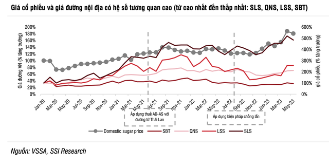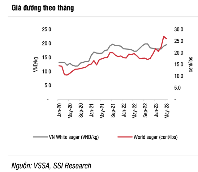 SSI dự báo, giá đường trong nước nhiều khả năng sẽ duy trì ở mức cao và đi cùng pha với giá đường thế giới trong năm 2023 do đường nhập khẩu chiếm 2/3 nguồn cung đường của Việt Nam. Hiện tại, SSI cho rằng giá đường tinh luyện sẽ duy trì quanh mức 20.000 đồng/kg, tăng 12% so với cùng kỳ năm trước từ quý II/2023.