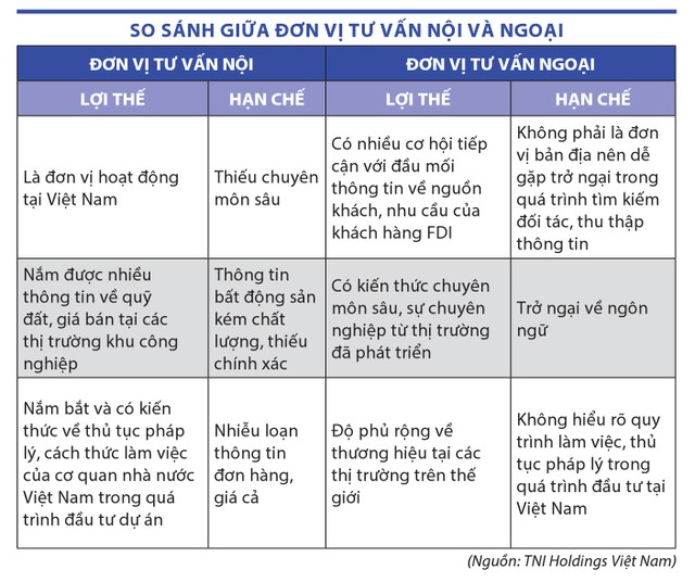 So sánh điểm mạnh, điểm yếu giữa môi giới nội và ngoại, ông Phạm Văn Nam, chuyên gia nghiên cứu bất động sản công nghiệp đến từ Cổng thông tin Khu công nghiệp Việt Nam cho rằng, đơn vị tư vấn nội có lợi thế lớn hơn so với đơn vị tư vấn ngoại trong việc tiếp cận nguồn cung, dễ tạo thiện cảm hơn với các chủ đầu tư dự án, hiểu rõ ngóc ngách thị trường tại từng địa phương…, nhưng điểm bất lợi là không chủ động được nguồn khách thuê dẫn tới hạn chế về khả năng tiếp cận, đặc biệt là các đơn vị tư vấn nội thường có quy mô không lớn nên không đủ nguồn lực theo đuổi các khách hàng lớn, dài hạn.