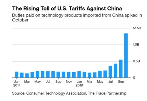 Số liệu của Hiệp hội Hàng công nghệ tiêu dùng và báo cáo phân tích từ hãng tư vấn The Trade Partnership cho thấy chi phí cho thuế nhập khẩu hàng công nghệ từ Trung Quốc của các doanh nghiệp Mỹ đã tăng hơn 7 lần, lên 1,3 tỷ USD trong tháng 10. So với năm ngoái, con số này cao hơn cả tỷ USD, trong bối cảnh hai nền kinh tế lớn nhất thế giới mắc kẹt trong một cuộc chiến thương mại.